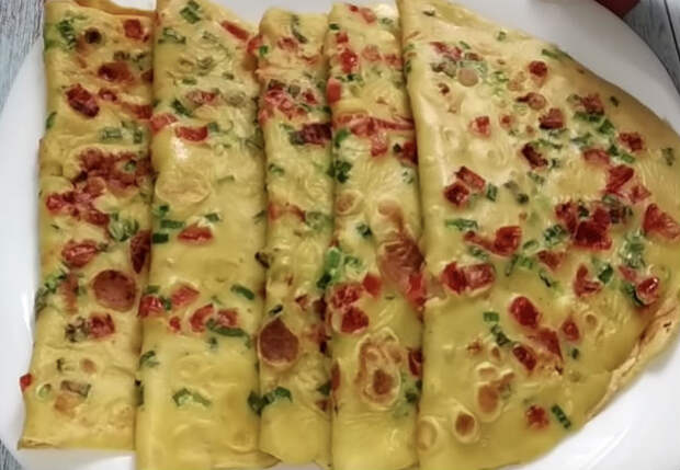 В пятнадцать минут приготовим совершенно особенный, сытный завтрак, который зарядит энергией на полдня вперед. Делать будем омлет наоборот: сначала смешаем ингредиенты с яйцами, а уж потом будем жарить. Омлет лучше делать из 5 яиц, добавки просят часто. На такое количество нам понадобится стакан молока, мука, пара помидоров, зеленый лук, сыр, соль и перец по вкусу.