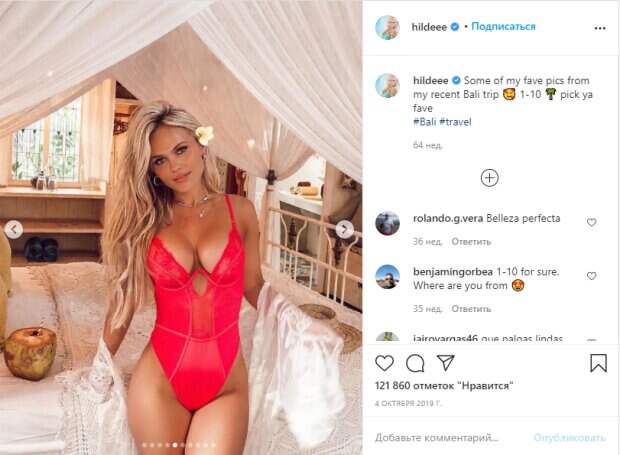При этом девушка успевает сняться для мужских журналов. Недавно Хильде объявила о своей беременности первенцем, поэтому в ее профиле начали реже появляться откровенные фото, теперь девушка делает акцент на изменившейся фигуре в милых образах. В то же время на фан-аккаунтах вспоминают лучшие бикини Осланд за последнее время. В красном белье с тонкими кружевами и на фоне белоснежной постели блондинка выглядела еще ярче чем обычно, а коктейль из кокоса рядом с ней придал образу некой экзотичности. Также Хильде украсила распущенные светлые локоны одним цветком. «Сколько не считай, она будет роскошной, точно. Ты откуда; Хорошо