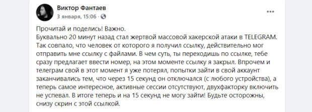 В приложении Telegram злоумышленники распространяют опасную ссылку Об этом рассказал пользователь сети Виктор Фантаев на своей странице в Facebook. Он уточнил, что если открыть присланную ссылку, то ваш аккаунт смогут взломать. При этом подвох состоит в том, что ссылка приходит от кого-то из ваших знакомых.