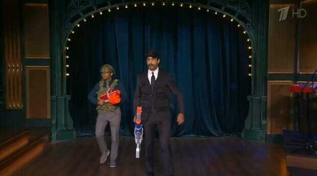 Известный российский телеведущий и шоумен Иван Ургант спародировал президента Белоруси, который появился перед ОМОНовцами в бронежилете и с автоматом Ургант пришел на эфир своей программы в бронежилете, надетом на костюм, в кепке, похожей на ту, в которой был Лукашенко в Минске, и огромным водным пистолетом.