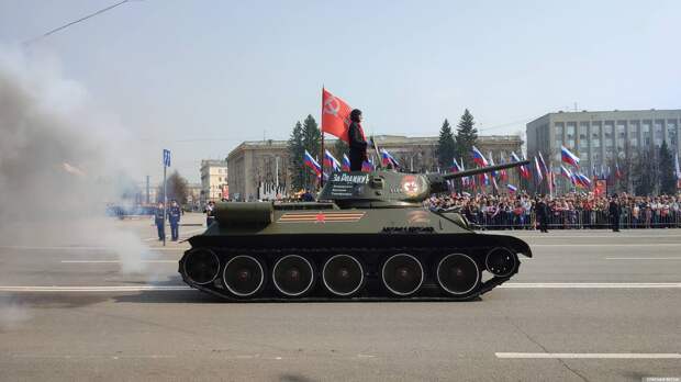Перед парадом танк заблаговременно сняли и подготовили к проезду по площади Советов. В это время по стойке смирно стояли колонны воспитанников военных учебных заведений, юнармейцы и личный состав военных и правоохранительных структур. Вслед за танком Т-34 следовал парадный расчет роты барабанщиков Президентского кадетского училища. Парад продолжила знаменная группа со знаменем 376-й Кузбасско-Псковской краснознаменной стрелковой дивизии во главе с участником СВО Павлом Усольцевым. Следом маршировали парадные расчеты Кемеровского президентского кадетского училища, открытого 29 апреля 2019 года. В Параде Победы приняли участие 300 обучающихся училища. Шествие продолжили сотрудники уголовно-исполнительной системы Кузбасса и женская парадная рота во главе с майором внутренней службы Ириной Долгановой. Среди юных участников военного парада были воспитанники губернаторской кадетской школы-интерната полиции, парадный расчет Юнармии и парадный расчет кадетов губернаторской женской гимназии-интерната. В память о подвигах советских кинологов и их питомцев во время Великой Отечественный войны прошел парадный расчет кинологической службы ГУФСИН России по Кузбассу. Завершил прохождение торжественным маршем сводный оркестр в составе губернаторского духового оркестра, оркестра Кемеровского президентского кадетского училища, оркестра главного управления МЧС РФ по Кузбассу. Сотрудники ФСИН Кузбасса провели показательное выступление по обращению с холодным и огнестрельным оружием. Следом за ротами начался парад техники. Его открыли три автомобиля УАЗ-469. С 1970-х годов эти автомобили являлись основными командирскими машинами в советской армии. Следом проехал современный бронеавтомобиль «Выстрел» ГУ ФСИН Кузбасса. Продолжила парад советская артиллерия. На тяге были продемонстрированы 152-мм гаубица образца 1943 года, советская 85-мм дивизионная пушка Д-44 и 45-мм противотанковая пушка образца 1937 года. Последней в ряду представлена 76-мм дивизионная пушка образца 1942 года на тяге автомобиля ЗИС-5. Далее на параде были представлены модели самоходной артиллерии времен Великой Отечественной войны. Речь о советской боевой машиной реактивной артиллерии БМ-13, известной как «Катюша». Парад завершился прохождением противопожарной техники военных лет, в том числе модификации ГАЗ-АА — пожарного автонасоса ПМГ-1 из техники главного управления МЧС России по Кузбассу. Напомним, с территории современной Кемеровской области на фронт Великой Отечественной войны ушло 333 165 кузбассовцев, в том числе более 22 126 добровольцев. Оставшиеся в Кузбассе люди обеспечивали надежную добычу угля и металлов, выплавку стали и производство пороха и других взрывчатых веществ. За эти заслуги указом президента России Владимира Путина в 2020 году Новокузнецк, а в 2021 году Кемерово были удостоены звания «Город трудовой доблести».