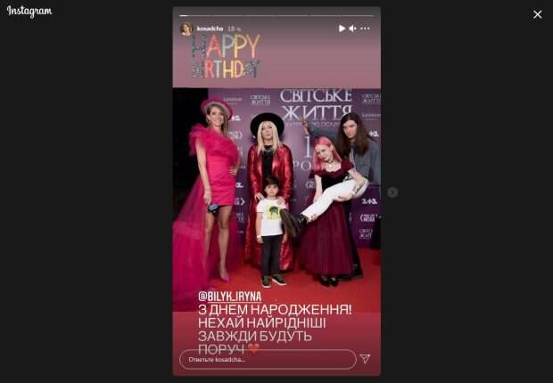 Одной из поздравляющих стала телеведущая Катя Осадчая, которая в своем сторис вспомнила прошлогоднее фото, сделанное в честь особенной даты - на праздничной вечеринке в честь 15-й годовщины проекта "Світське життя". В кадре предстали Ирина Билык с младшим сыном, Табризом, а рядом с ними позировали старший сын звезды - Глеб Оверчук со своей возлюбленной. Отметим, своего первого сына певица родила в 1999 году от модели Андрея Оверчука. Однако некоторые пользователи сети увидели его сходство с известным певцом Андреем Кузьменко (Кузьма Скрябин), о чем тогда написали в комментариях, сделав комплименты. "А Глеб чем-то очень похож на Кузьму, поразительно!!! Очень красивые дети!!!