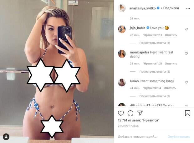 Фигура подруги-блондинки ничуть не хуже, чем у самой Квитко. Пышные бедра, огромная грудь и тонкая талия – всё это красотка продемонстрировала в микроскопическом купальнике, который она надела для фотосессии. На фото девушка застыла в душе с телефоном в руке. Пользователи в восторге. Всего за полчаса фотоснимок набрал свыше 20 тысяч отметок «мне нравится» и с каждой минутой их становится всё больше. Фанаты усыпали модель множеством восхищенных комментариев и по достоинству оценили формы девушки. «Красотка», «Вы очень похожи», «Ты самая красивая девушка, которую я видел», «Одно лицо», - пишут в сети. Ранее мы сообщали, что модель Анастасия Квитко соблазнила видами в маечке с кружевом. Модель, по всей видимости, будто собралась на прогулку и перед выходом из дома засняла в зеркало свой лук. Анастасия надела светлую маечку с кружевом на декольте. Благодаря большому вырезу можно насладиться видами на большую грудь. Формы едва не рвали собой тонкую ткань. Модель распустила волосы откидывая их в сторону, чтобы лучше продемонстрировать идеальные формы: "Какие же они огромные". Также на красотке была атласная юбочка, идеально севшая на округлых бедрах. Завершили образ различные аксессуары, в том числе, стильные очки. Напомним, что Анастасия Квитко вышла на прогулку, сверкнув объемами в маленьком топике: "Это шикарно". Как ранее сообщала Politeka, Анастасия Квитко в дырявом купальнике сжала «булочки» прямо перед камерой: «Очень сочная». Также Politeka писала, что Анастасия Квитко едва удержала сладкие "кексики" в тонком лифчике: "Лучше всякого десерта".