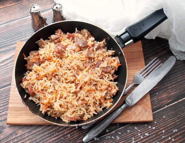Мы часто готовили его с друзьями, он же мой последний рецепт перед выселением. Понадобятся: лук, морковь, чеснок, растительное масло, тушенка и рис. В комнате мы выполняли все подготовительные процедуры: промывали рис и мелко нарезали морковь, лук и чеснок. Затем, всё это с посудой и тушёнкой переносили на коридорную кухню и обжаривали.