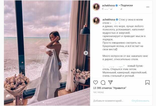 Анфиса зачесала за ушко волосы, опустив глаза и сделав образ каким-то загадочным. Возле телеведущей можно заметить не только заправленную постель, но и букеты роз. На другом кадре Чехова уже стояла с чашечкой кофе и улыбнулась. Из ее номера открывался красивый вид. Чехова рассказала в посте, что отдыхает в Сочи, где успокаивается под звуки волн. "Просто ежедневно смотреть на бушующие волны, и все встает на свои места
