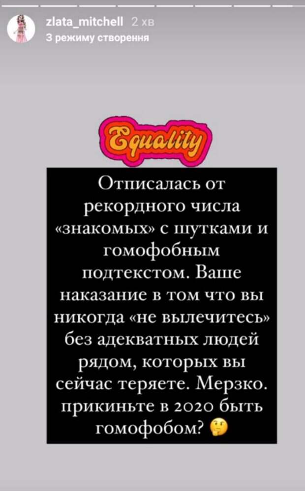 По мнению Златы, такая позиция является странной для 2020 года, и это "мерзко". "Отписалась от рекордного количества "знакомых" с шутками и гомофобным подтекстом. Ваше наказание в том, что вы никогда "не вылечитесь" без адекватных людей рядом, которых вы сейчас теряете. Мерзко. Прикиньте, в 2020 году быть гомофобом?" - написала девочка. При этом она не объяснила, какие именно шутки ее так разгневали, и о каких знакомых идет речь. Ранее сообщалось, что Злата опубликовала в сторис свое новое селфи, где она позирует в магазине одежды или шоуруме. При этом на дочке Фреймут можно заметить стильный черно-белый плащ с интересными рисунками. Девочка, кажется, сама удивляется тому, как быстро она меняется. "Когда я перестала выглядеть, как я?" - написала она рядом с собственным фото. Напомним, что Фреймут призналась, как стала женой известного продюсера: "навязчивая женщина может быть вульгарной, но...". Как сообщала Politeka, Ольга Фреймут призналась, как ей удалось пробиться на телеэкраны: "родилась в бедной больнице..." Также Politeka писала, что Ольга Фреймут показала любовь с мужем прямо в ресторане, редкие семейные кадры: "сразу повеселел".