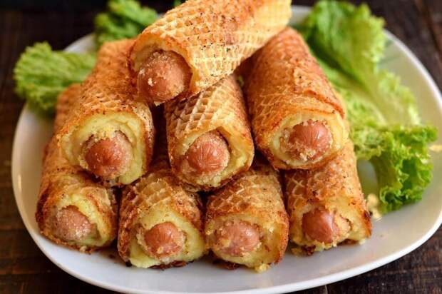 Готовим сосиски в картофельном тесте. Чтобы картофель не распадался при жарке, картофельное пюре наносим на тонкие вафельные коржи, в которые скручиваются сосиски. Сосиски используйте хорошего качества, средней толщины и длины. Рулетики жарятся в масле на сковороде. Если у вас есть уже готовое картофельное пюре, то блюдо можно приготовить всего за 30 минут.