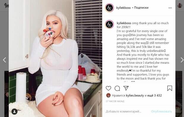 Белая ткань подчеркнула шикарный бюст, пышные бедра и, конечно, тонкую талию. Кокетка запрыгнула на стол и с какой-то жадностью поедала аппетитное пирожное. Стоит отметить, что модель распустила длинные волосы белого цвета. Кадр был сделан, когда модель праздновала 21-летие, то есть два года назад. "Всем огромное спасибо за 200к!!! Я так благодарен за каждого из вас, ребята - это путешествие было таким потрясающим, и я встретил на этом пути некоторых удивительных людей ... Я до сих пор помню, как набрал 5, 10 и 50 тысяч, будто это было вчера, это действительно невероятно ... И в основном спасибо Кайли, которая всегда вдохновляла меня и проявляла столько любви с тех пор, как я начал, она значит для меня весь мир, и я люблю ее бесконечно ♥ ️ Я так благодарен своим друзьям и сторонникам, я люблю вас, ребята, до луны и обратно спасибо за все