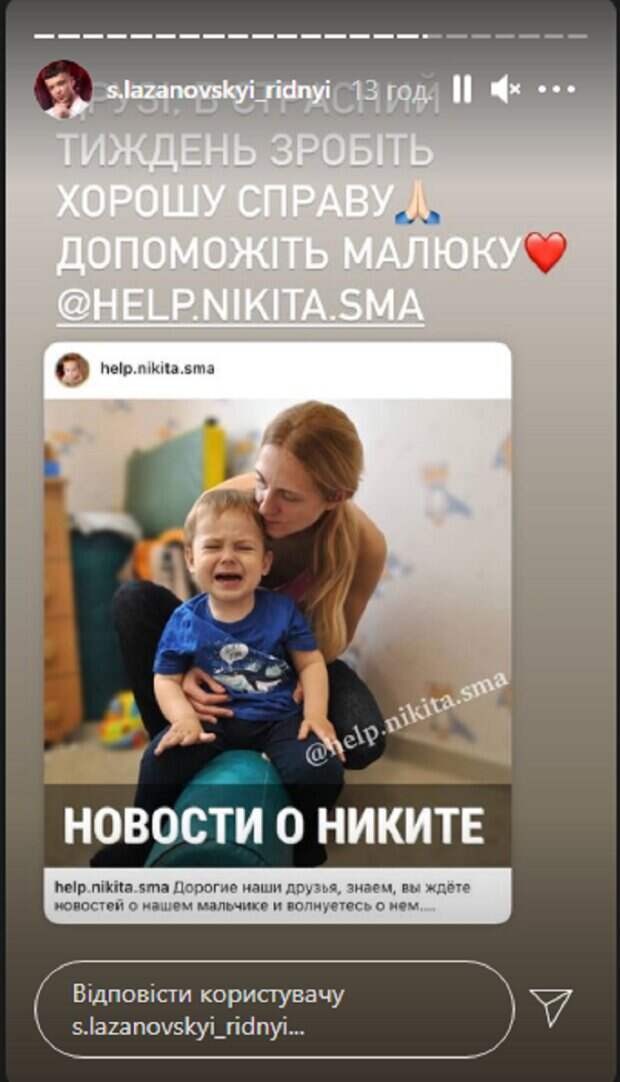 Парень опубликовал в сторис снимок малыша и оставил ссылку на страницу, на где проходит сбор средств. "Друзья, в страстную неделю сделайте доброе дело, помогите малышу", - пописал сторис Сергей Лазановский. Отметим, что речь идет о мальчике Никите, у которого смертельное заболевание – спинальная мышечная атрофия. Родители просят украинцев о помощи, ведь лечение стоит очень дорого, а таких средств у семьи нет. "Никите противопоказана строгая диета, так как показатели его биохимии крови плохие, в особенности очень низкий гемоглобин. Его грудная клетка начала деформироваться, кифоз прогрессирует, к сожалению. Реабилитолог не советует надевать Никите корсет, так как он будет ускорять атрофию мышц нашего сыночка. Никита в последнее время очень много плачет и практически не спит. Доктор связывает это с головными болями, которые может провоцировать кифоз", - говорится в подписи к публикации, которую распространил на своей странице Сергей Лазановский. Напомним, Сначала отец, потом мать: 13 деток осиротели за неделю, что ждет маленьких украинцев. Как сообщала Politeka, "12 детей остались сиротами": COVID-19 отправил на тот свет украинскую пару-родителей большого семейства. Также Politeka писала, В Киеве мошенник устроил сбор денег "на помощь детям" и жестоко поплатился, видео.