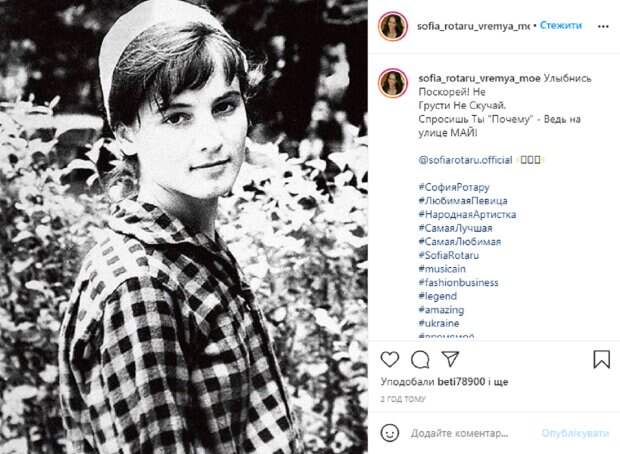 В соцсети Instagram есть множество фан-страниц, посвященных звезде, где пользователи обмениваются ее снимками, в том числе и архивными. Так, недавно на одной из таких страниц опубликовали милое черно-белое фото, на котором звезда еще совсем юная. На снимке молодая девушка София Михайловна запечатлена среди густой зелени, она вышла на прогулку и была как будто случайно снята. Перед камерой будущая легенда появилась в простой клетчатой рубашке, ее волосы небрежно уложены и спрятаны за платком, а на лице нет и следа косметики, только девичья красота и свежесть, она внимательно смотрит прямо в объектив. В подписи к фотографии говорится: "Улыбнись поскорей! Не грусти, не скучай. Спросишь ты "почему" – ведь на улице май!". Пользователи в восторге от такого трепетного фото легендарной артистки, ее засыпают комплиментами и приятными пожеланиями в комментариях к фотографии, некоторые отметили, что она совсем не изменилась. "Будущая звезда!", "Вроде это было недавно! Всех благ!", "Ах, совсем юная!", "Какая красивая и естественная", "Красотка", - пишут восторженные поклонники Ротару в комментариях к фото. Напомним, Молодая София Ротару в черном наряде взбудоражила фанатов, редкое фото: "Годы прошли мимо". Как сообщала Politeka, Внучка Ротару показала сладкий подарок от жениха-миллионера на годовщину: трогательные кадры. Также Politeka писала, София Ротару удивила внешним видом, "утонув" в свитере не по размеру: "Здесь совсем другая".
