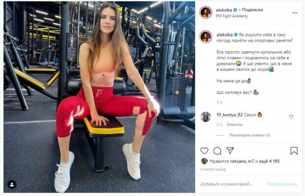 Известная украинская телеведущая Александра Лобода, звезда "ПроФутбола", показала себя на тренировке На фото красотка позирует в красных лосинах и белых кроссовках, а образ дополнила узеньким топом. Звезда сидит на одном из тренажеров в спортзале, где продолжает усердно следить за своей фигурой. Волосы у Лободы были распущены, а ножки Александра расставила для снимка.