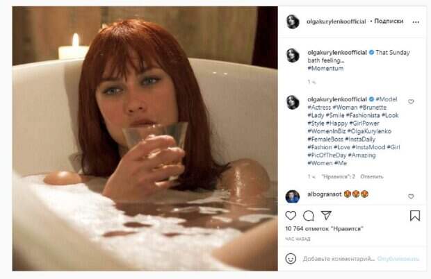 Известная актриса Ольга Куриленко, которая сыграла роль девушки Джеймса Бонда, показала себя, рассказав про воскресенье На фото Ольга показала себя без одежды и белья. Куриленко нежилась в ванной с пеной, а рядом можно увидеть свечу. Красотка держала в руках бокал, засмотревшись куда-то. Девушка совсем не смущалась своего тела, хвастаясь мокрыми изгибами.