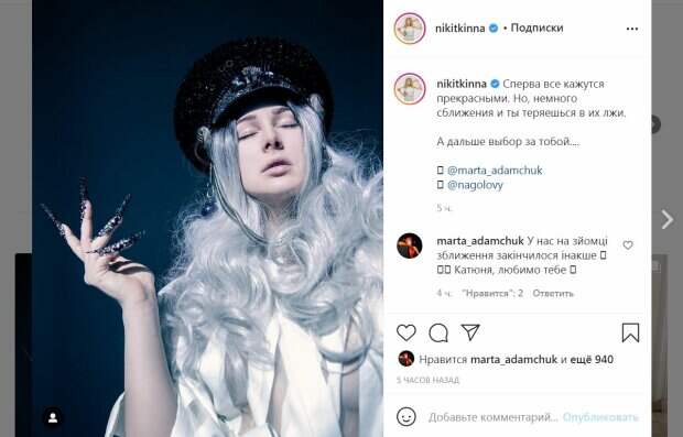 В этот раз Екатерина решила удивить поклонников, появившись в новом, необычном образе. Артистка позировала в полупрозрачном наряде, под котором просматривалась обнаженная грудь. Красотка надела седой парик из волнистых локонов, а сверху - сверкающую черную кепочку. Черные украшения на пальцах стали дополнительным акцентом - получились ногти-сабли. "Сперва все кажутся прекрасными. Но, немного сближения и ты теряешься в их лжи. А дальше выбор за тобой...", - написала артистка. За четыре часа публикация собрала более 900 лайков и много комментариев. К слову, фото сделала коллега Екатерины, Марта Адамчук, которая увлекается съемкой. "У нас на съемке сближения закончилось иначе