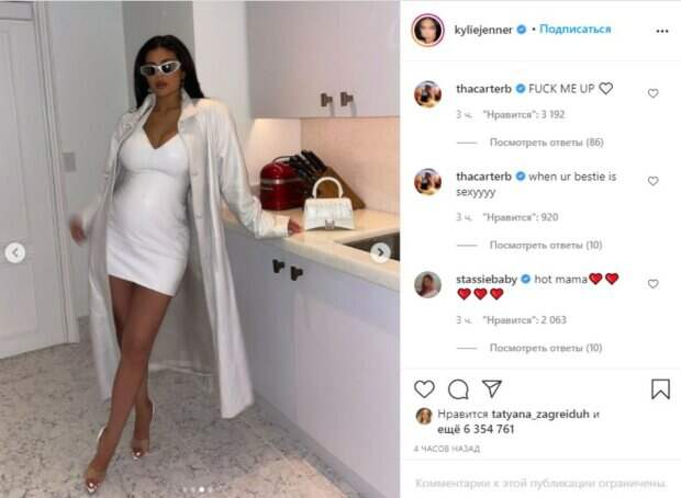 А сегодня Кайли решила показать весьма смелый образ и засветила не только округлый живот. В белом кожаном платье с аккуратным вырезом Кайли покрасовалась на кухне. Причем свой лук звезда дополнила лаковым плащом, оставив тот расстегнутым, а яркий макияж завершил ее образ. Главный акцент на животе, обтянутым кожаным мини-платьем сразу привлек внимание фанатов к себе: «Вау, какая невероятная леди; когда твоя лучшая подруга прекрасная в любом виде; шикарная мама❤; я вижу эту шишку❤️