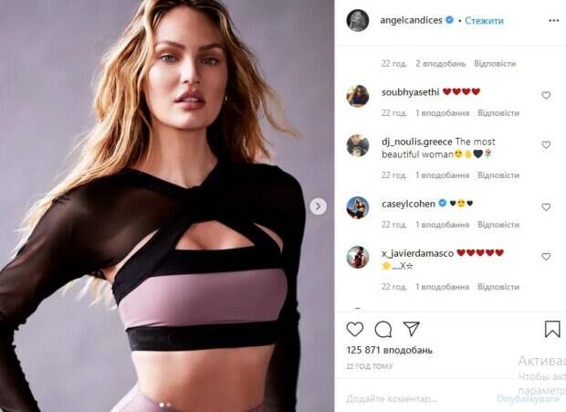 Также модель поделилась снимком, на котором она в полный рост застыла в игривой позе, демонстрируя безупречную фигуру. «Ох, этот взгляд. Не могу насмотреться», «это так невероятно. Поздравляю тебя, ты волшебная», «вот, что значит королева», «тебе хорошо в этом наряде, если ты не знала. Но думаю, что ты и так в курсе этого», «самая красивая девушка в мире», - пишут ее поклонники. До этого мы рассказывали, что известная модель из Victoria’s Secret Кэндис Свэйнпол показала себя на радость фанатов. На фото красотка позирует в юбке, футболке и "невидимых" лосинах, а также пуантах. Кэндис стояла на цыпочках, оставив волосы распущенными. На втором фото девушка уже села на коленки и хвасталась идеальной фигурой на кожаном кресле, смотря прямо в объектив камеры. Напомним, звезда Victoria’s Secret Кэндис Свэйнпол восхитила раскованностью на пуантах А еще Politeka писала, что белокурый ангел Victoria's Secret скинула одежду, засветив упругости и сладкие изгибы Также Politeka сообщала, что полностью раздетая звезда "Victoria’s Secret" Кэндис Свейнпол разожгла огонь страсти