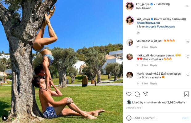 Через несколько месяцев они смогли одержать победу, а сейчас они стали новыми судьями шоу "Україна має талант. Так, на этот раз на странице хореографа в Инстаграм появилось новое фото. Как известно, уже как 2 года Евгений Кот женат на финалистке 7-го сезона шоу "Україна має талант" и танцовщицей стиля "pole dance" Наталья Татаринцева. "Дайте название публикации", — предложил хореограф. Стоит отметить, что Евгений часто со своей женой публикует подобные снимки, где показывает, насколько красива его избранница-спорстменка. Поклонники предложили несколько вариантов, как бы назвали публикацию: "Настоящая семья! Кот и кошечка", "Коты чудят", "Просто бомба", "Восхищаюсь вашими поддержками", "Змея-искусительница". Ранее сообщалось, Женя Кот и Мишина сорвались на крик из-за новой участницы "Україна має талант": "Как вы это делаете?" Также, судья "Україна має талант" Женя Кот своим поступком довел до крика родную бабушку: "Я так каждый день делаю" Politeka рассказывала, судья "Україна має талант" и победитель "Танців з зірками" Женя Кот хвастнул торсом без футболки : "Не останавливайтесь"