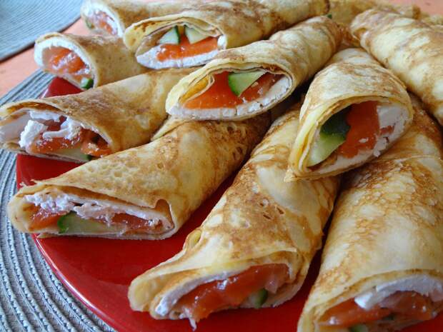Такие вкусные и аппетитные блинчики съедаются на праздничном столе в первую очередь. Ингредиенты: для блинчиков: яйца -2 штуки; молоко — 0,5 литра; мука — 250 грамм; подсолнечное масло — 3 столовых ложки; сода — 3/4 чайной ложки погашенная лимонным соком или уксусом; соль — 1/2 чайной ложки; сахар — 1 столовая ложка.