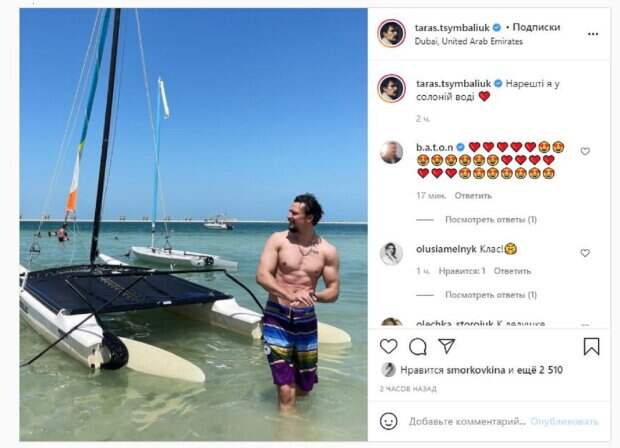 Красавчик уехал на отдых в Дубай, ОАЭ. Мужчина стоял без футболки и в длинных шортах, зайдя частично в воду. Цымбалюк находился у катамарана, отведя взгляд от камеры. "Наконец-то я в соленой воде", - написал коротко Цымбалюк. Фанаты поставили несколько тысяч лайков и написали комментарии: "Класс", "К дедушке поехал?", "Лови волну, хорошего отдыха", "Самого лучшего и невероятного отдыха", "Ух ты, какой сладенький", "Две машины на одном фото", "Класс, позитивного настроения и хорошего отдыха", "Какая красота! Больше фоток на море!!!!", "Не только в соленой, а еще и в теплой, прозрачной, кайфовой, аж начало пахнуть под носом". Мы писали, что украинский актер Тарас Цымбалюк удивил внешним видом. У себя в Инстаграм актер опубликовал анонс сериала, в которой будет сниматься. Поклонники были ошеломлены внешним видом звезды. Напомним, Цымбалюк из "Спіймати Кайдаша" прямо на улице испытал стальные мышцы на прочность А еще Politeka писала, что Цымбалюк из "Спіймати Кайдаша" заворожил Сумскую, поиграв стальными бицепсами Также Politeka сообщала, что Цымбалюк из "Спіймати Кайдаша" впечатлил очень дорогой покупкой