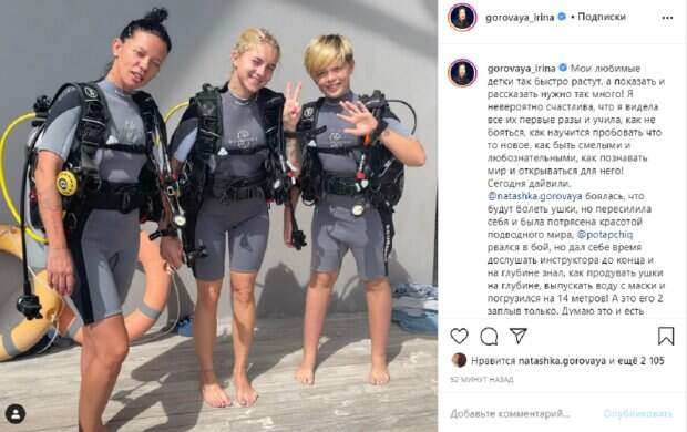 Не забывает Горовая периодический выкладывать фотоснимки и делится своими впечатлениями от отпуска. На последнем фото Ирина с детьми запечатлена в серых костюмах для дайвинга, а в публикации она рассказала, как прошло погружение в воду. «Сегодня дайвили, @natashka.gorovaya боялась, что будут болеть ушки, но пересилила себя и была потрясена красотой подводного мира, @potapchiq рвался в бой, но дал себе время дослушать инструктора до конца и на глубине знал, как продувать ушки на глубине, выпускать воду с маски и погрузился на 14 метров! А это его 2 заплыв только», - рассказала она. «Думаю это и есть счастье - видеть, как твои растут и познают прелесть мира, природы и неимоверного семейного счастья) любите своих деток и наслаждайтесь каждой минутой рядом с ними