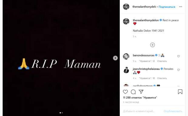 Перед смертью Натали Делон находилась в окружении своих близких. Натали Делон (до замужества Бартелеми) была первой и единственной женой Алена Делона. В своем время именно благодаря нему она попала в кинематограф. Актриса сыграла в десятке фильмов. Особым успехом пользовалась их с Делоном совместная картина «Самурай» (1967 года). В браке с легендарным актером Натали прожила четыре года, однако и после развода она продолжила сниматься в кино. Отметим, что сам Ален Делон в прошлом году перенес инсульт и был госпитализирован. Тогда и Натали, и Энтони находились с ним в больнице. Напомним, что после инсульта у Делона произошло кровоизлияние и образовалось нежелательное скопление крови внутри организма, в связи с чем артисту приходилось восстанавливаться в элитной клинике Швейцарии. Поклонники всемирно известного актера были так напуганы этой новостью, что принялись искать в интернете информацию о том, действительно ли их кумир умер. Напомним, сын Алена Делона поразил признанием после слухов о его смерти, «Мы не могли…». Как сообщала Politeka, не стало знаменитого актера, его фильмами наслаждались миллионы. Также Politeka писала, что умер скандальный друг Алена Делона: "не дожил до юбилея", первые подробности трагедии.