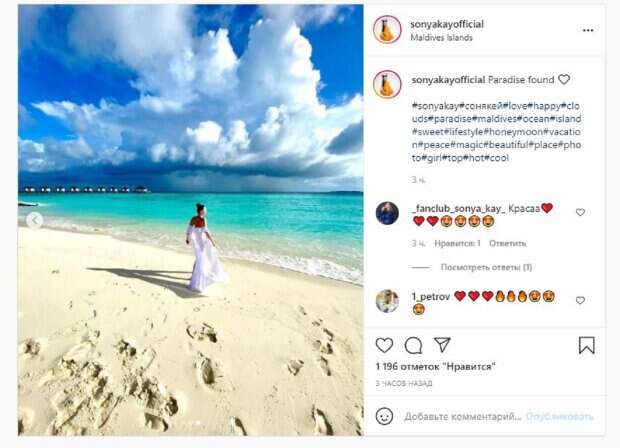 Этот раз не стал исключением, ведь Соня показала, как гуляла в бикини по пляжу, прикрываясь только легким парео. Девушка шла от воды, демонстрируя роскошную фигурку, пока снимал муж. "Рай найден", - написала Соня под публикацией в Инстаграм. Фанаты поставили более тысячи лайков и написали комментарии: "Красота", "Первое фото вообще, Богиня!", "Грация из солнца, моря и ветра"."Слишком роскошно выглядит, чтобы быть правдой. Хорошего отдыха". Сообщалось, что певица Соня Кей, вызвала у поклонников зависть одним фото. На последнем фото, опубликованном Соней в Инстаграм, девушка предстала на прогулке в белой рубашке и коротких темных шортиках. Соня проходила мимо ресторанчика - вокруг ни души, только роскошная природа Мальдив. Напомним, племянница Ротару показала мужа-хоккеиста, сделав фото в ванной А еще Politeka писала, что племянница Ротару в купальнике показала, как плещется в океане Также Politeka сообщала, что племянница Ротару в мини-бикини устроила шалости на пляже Мальдив