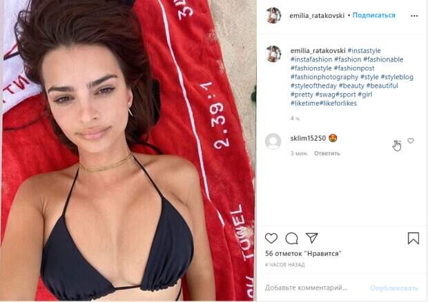Звезда имеет роскошную фигуру: пышный бюст, тончайшую талию и упругие ягодицы, поэтому многие модели купальников на ней смотрятся просто потрясающе. На снимке, который размещен на фант-страничке в Инстаграм, Ратаковски попозировала лежа на полотенце в черном бикини. В кадр попала только верхняя часть купальника с роскошной грудью модели, которую она с гордостью демонстрирует. Фолловеры восхитились внешним видом супермодели в комментариях, описав ее кратко: «само совершенство». Ранее Эмили опубликовала фото, на котором была запечатлена с идеальной загорелой кожей и распущенными волосами выглядела довольно по-домашнему и просто. За ее плечами можно заметить ремешок от небольшой сумочки, а в качестве украшений звезда оставила лишь массивные сережки-кольца. По словам фанатов, девушка всегда выглядит, как "дикая кошечка". Эмили Ратаковски стала настоящей звездой соцсетей благодаря своим невероятно горячим формам и фото, на которых она демонстрирует их во всех красе. Подобные кадры вовсе не надоедают ее подписчикам, ведь каждый раз они вызывают настоящий ажиотаж в сети. Напомним, лохматая Эмили Ратаковски ошеломила переменами во внешности, стала еще красивее Также Politeka писала, что Ратаковски разделась и без стеснения показала, чем ее наградила природа А еще Politeka сообщала, что Ратаковски без лифчика повеселилась перед зеркалом в томной позе