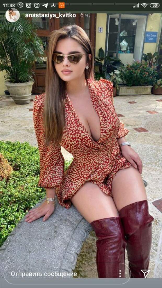 Красотка позировала сидя, немного задрав такой игривый наряд и похваставшись стройными ножками. На последние она натянула красивые ботфорты вишневого цвета. Такая обувь смотрелась на звезде просто завораживающе. Игривое платьице с глубоким вырезом немного приоткрывало виды на пышную грудь. Прелести модели едва ли не выпрыгивали из декольте; красотка - само великолепие. Анастасия также выделила стройную талию. Завершило образ известной красотки много украшений, особенно притягивают взгляд стильные очки. Квитко распустила волосы, аккуратно уложив их набок. Фото не собрали много лайков и комментариев, так как в сториз нет такой возможности. Напомним, Анастасия Квитко показала большие формы в облегающих майке и лосинах. Огромное декольте маечки позволило посмотреть на пышные груди красотки, которые соблазнительно выпятились из него. Звезда позировала возле зеркала, снимая свою фигуру с самых выгодных ракурсов. Ранее сообщалось, что Анастасия Квитко позировала в тесных штанах, демонстрируя упругие формы во всей красе. Дополнял образ красотки практически невидимый топ. «Само совершенство», «Любимая ты само совершенство и божество я люблю тебя красавица», «выглядишь фантастично», - написали пользователи сети. Напомним, российская Кардашьян пленила аппетитными формами в откровенном купальнике: «Так жарко». Как сообщала Politeka, русская Кардашьян с самых жарких ракурсов показала свои сочные достоинства: "Конфетка". Также Politeka писала, что русская Кардашьян задала «жару» в тесном наряде, горячие кадры: «Само совершенство»