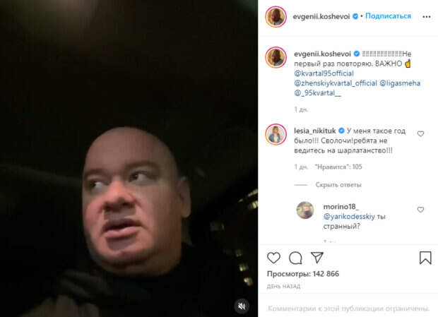 "Никаких розыгрышей, ни студия "Квартал 95", ни я лично - не проводим. Не ведитесь на этот развод! С "разводчиками" боремся, пытаемся их банить... Не ведитесь и тем более не тратьте последние деньги. Официальные розыгрыши проводятся только на официальных страничках "Квартал 95" и актеров. Перестаньте выплескивать свои эмоции на других!", - говорит на видео взбешенный Евгений. Одной из первых пост прокомментировала телеведущая Леся Никитюк, столкнувшаяся с такой же проблемой. "У меня такое год было!!! Сволочи! Ребята, не ведитесь на шарлатанство!!!", - поддержала звезда Кошевого. Другие пользователи поблагодарили за предупрждение: "Женя - вы лучший