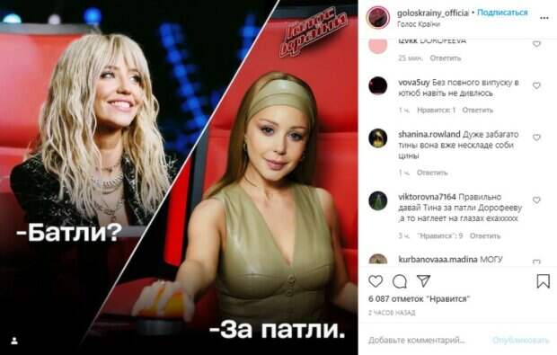 За патлы", - лаконично, но искрометно подписано фото. "Воу-воу, неужели будет Fight за талантливых участников между @tina_karol и @nadyadorofeeva? Звездные наставники решительно настроены на победу