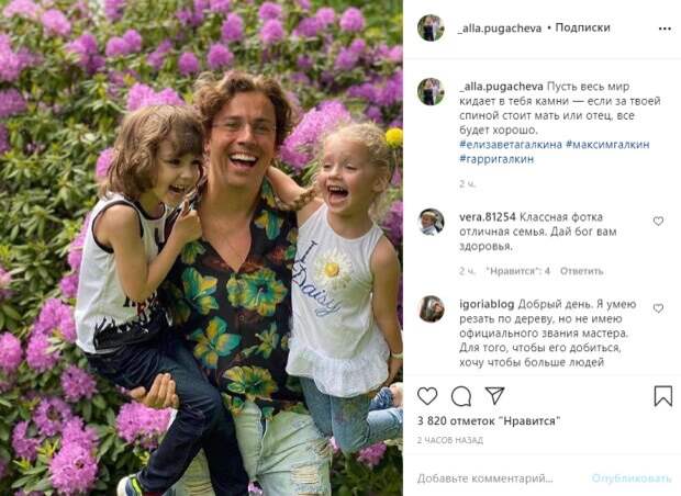 Счастливый отец подхватил своих деток в обе руки. Вся троица задорно смеется и видно, что они очень весело проводят время вместе. «Пусть весь мир кидает в тебя камни — если за твоей спиной стоит мать или отец, все будет хорошо», - говорится в подписи. Поклонник не смогли пройти мимо летнего снимка и отреагировали различными комментариями. «Классная фотка отличная семья. Дай бог вам здоровья», «Красивая и счастливая семья!!!!! Сплошной позитив!!!! ❤️», «Прелесть, счастье во всех лицах!!! 😍», «Скоро папа уже не поднимет двоих», «Просто фото дня!!!!😁😁😁😁😍😍😍😍», «Прикольные, детки🤗❤️👏😂😍🤗❤️👏», «Красавы», - пишут в сети. Ранее шоумен Максим Галкин похвастался спортивной активностью детей от Аллы Пугачевой. В ролике дочь Галкина и Пугачевой, Лиза, занимается на гимнастических кольцах. Первый прыжок оказался неудачным, но со второй попытки девочка допрыгнула до них, а затем начала раскачиваться. Видимо, погода выдалась прохладной, потому что на малышке штаны, кофта и джинсовая курточка. Напомним, в семье Пугачевой ожидается пополнение, Лиза и Гарри будут счастливы: "Девочку назовут..." Как сообщала Politeka, стало известно, на кого на самом деле похож сын Пугачевой и Галкина: "Тут уже без слов! " Также Politeka писала, что Алла Пугачева кардинально изменилась и растрогала кадрами с детьми: "Копия мамы"