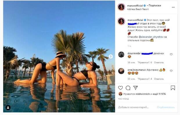 Об этом пишет Politeka.net со ссылкой на страничку знаменитости. "Этот пост, про мой охуенный отдых в этом году. Желаю всем так висеть, от всей души! Жизнь одна, кайфуйте", - написала девушка под фото. Фанаты поставили более 11 тысяч лайков и написали комментарии: "Классные дамочки", "Вот нам бы подружку как у тебя, и тоже был бы классный отдых", "да все натуралы так делают, вы чего", "Мне тока мечтать о таком", "После этих фоток булка в рот не лезет", "Искренне за тебя рада. Ты на это заслужила трудяга". Сообщалось, певица MARUV (Анна Корсун) рассказала, что не смогла вернуться домой после отпуска. MARUV, которая отдыхала в одном из самых популярных отелей ОАЭ вместе с мужем Александром Корсуном, уже должна была вылететь домой, но этого не произошло. Обо всем артистка рассказала на своей странице в «Инстаграм». Напомним, располневшая MARUV поразила внешним видом в розовом мини с лифчиком наружу А еще Politeka писала, что дерзкая MARUV показала свои аппетитные округлости в смелом купальнике Также Politeka сообщала, что нескромная MARUV в одних трусах потрусила «орешком» посреди пустыни