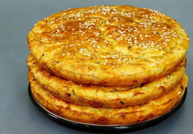 ② Нарезать половину болгарского перца и соединить с репчатым луком. Также можно еще взять зеленый лук.③ Затем добавить растопленное масло и яйца.④ Просеянную муку смешать с дрожжами и также добавить. Массу немного перемешать миксером (или ложкой), влить теплую воду.⑤ Готовое тесто оставить в тепле на 40 минут.⑥ Затем взять одну большую форму или несколько маленьких, смазать растительным маслом. Выложить тесто, смазать взбитым яйцом. По желанию посыпать кунжутом.⑦ Выпекать лепешки в духовке в режиме «конвекция» 35 минут при 180 ℃.