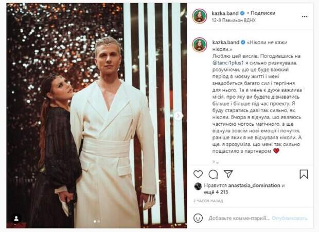 В Инстаграм Александра рассказала, что чувствует к своему партнеру. "Никогда не говори никогда". Люблю это выражение. Согласившись на @ tanci1plus1 я сильно рисковала, понимая, что это будет тяжелый период в моей жизни и мне понадобится много сил и терпения для него. И у меня есть очень важная миссия, о которой вы будете узнавать больше и больше во время проекта. Я буду стараться дальше так сильно, как никогда. Вчера я почувствовала, что являюсь частью чего-то магического, а еще почувствовала совершенно новые эмоции и чувства, ранее которых я не испытывала никогда. А еще, я поняла, что мне так сильно повезло с партнером", - написал Александра. Фанаты поставили более 4 тысяч лайков и написали комментарии: "Засверкала звездочка", "Выступление крутой, Саш ты молодец мы с тобой", "Вы очаровательная, созерцала по вашему танцем на одном дыхании", "Я вас, особое уважение партнеру он вас очень дополняет и мне кажется окрыляет". Напомним, солистка KAZKA Зарицкая дала жару в первом эфире "Танців з зірками" А еще Politeka сообщала, что солистка KAZKA Зарицкая засветилась со стройным красавчиком из "Танців з зірками" Также Politeka писала, что солистка KAZKA в платье с большим вырезом впечатлила формами даже экс-ВИА Гру