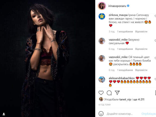 На фото Ирина предстала в очень соблазнительном образе с черными волосами. Она засветила свой животик, поскольку из одежды на ней был кружевной топ и легкий халатик. На снимке актриса выглядела совсем другим человеком. «Я солнце, я луна…», - загадочно подписала фото актриса. В комментариях Сопонару оставили массу приятных слов. «Как же тебе круто темненькой», «Классно! Не узнать Иришку!», «Я влюблен», «Черная дама!», «Что за красотка?», «Вы все больше и больше нас балуете такими фотографиями», «Ирина Сопонару, вам всегда хорошо, и черной и белой, на спине и на животе», «Ой, темный цвет как тебе хорошо! Прямо бомба! Раскрылась», - пишут пользователи сети. Ранее мы писали, что Ирина Сопонару поделилась соблазнительным снимком, на котором она во всей красе продемонстрировала свое симпатичное лицо. Напомним, что блондинка из «Женского квартала» в экстра-мини показала все достоинства фигуры: "Вау, серьёзная тетя". Как сообщала Politeka, блондинка из "Женского квартала" похвалилась точеной фигуркой в платье из перьев: "Лучшая". Также Politeka писала, что блондинка из «Женского квартала» в экстра-мини впечатлила длиной ног: «А взгляд какой!».