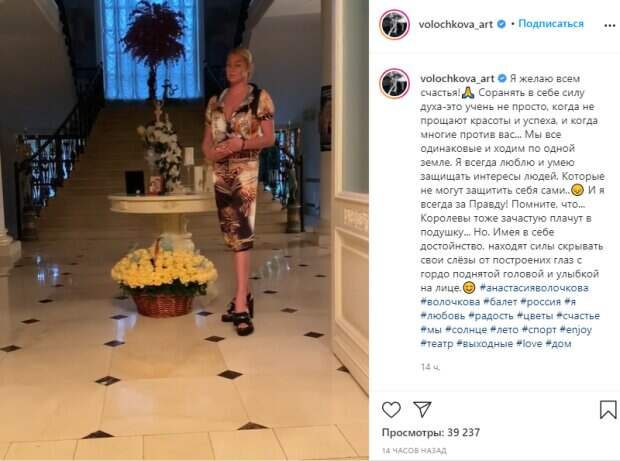 Долгое время она рассказывала об этом, пытаясь отбелить свою репутацию и рассказать правду о событиях того дня, пишет Politeka.net. В этот раз в домашнем и несколько уставшем виде Волочкова появилась в необычном свободном костюме, скрывшем ее фигуру, босоножках на необычно высоком каблуке и без макияжа. Анастасия засветила уставшее лицо рядом с букетом роз, которыми хотела похвастаться в очередной раз: «Я желаю всем счастья!🙏 Соранять в себе силу духа-это учень не просто, когда не прощают красоты и успеха, и когда многие против вас... Мы все одинаковые и ходим по одной земле. Я всегда люблю и умею защищать интересы людей. Которые не могут защитить себя сами..😔 И я всегда за Правду! Помните, что... Королевы тоже зачастую плачут в подушку... Но. Имея в себе достоинство, находят силы скрывать свои слёзы от построених глаз с гордо поднятой головой и улыбкой на лице.😊 #анастасияволочкова», - написала Волочкова. Причем ранее под похожим видео ей написали, что балерине уже "даже пластика не поможет". До этого в своем профиле Анастасия выложила фотографии из поездки в Астрахань. Один из снимков, сделанных женщиной, насмешил социальную сеть. Балерина позировала в платье с глубоким декольте и надела поверх него шубу. «Посетила я храм на территории Кремля в Астрахани и удачно попала в момент , когда шла Служба.🙏 Так здорово, что теперь храмы открыты и молиться можно не только дома...🙏», - написала Волочкова. Открыв комментарии под постом, она получила множественные слова с критикой в свой адрес: «Настя , что у вас в голове ? Вы из какой вселенной ?», «А шубу зачем летом пялить?», «Вы вернули девушке её обруч???», «Вот прицепились к шубе! А где ей еще ее носить по-вашему?», «Зимой шорты, летом шуба? Почему?», «В теплице в шубе....в церкви в шубе...везде в шубе», «Вам в шубе при +40 градусов в тени не жарко ?)», «Как совести хватает зайти в храм с непокрытой головой и оголенным выменем ( грудью это не назовешь)», «В церковь можно было и поскромнее одеться..это же не павильон НТВ..за чем людей раздражать, и устраивать из всего понты». Напомним, скандальная Волочкова сделала свой фирменный шпагат в компании мужчин А еще Politeka писала, бесстыжая Волочкова задрала балетную пачку и засветила пикантные места Также Politeka сообщала, Волочкова сверкнула исхудавшими ногами в шерстяных сапогах