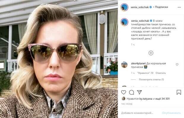 Скандальная российская телеведущая и журналист Ксения Собчак огорошила новым снимком в соцсети Как сообщает Politeka со ссылкой на Инстаграм знаменитости, Собчак выложила два новых снимка, на которых она запечатлена с новой прической и в солнцезащитных очках. "В моем тинейджерстве такая прическа, со стоячей дыбом челкой ,называлась «лошадь хочет какать» .