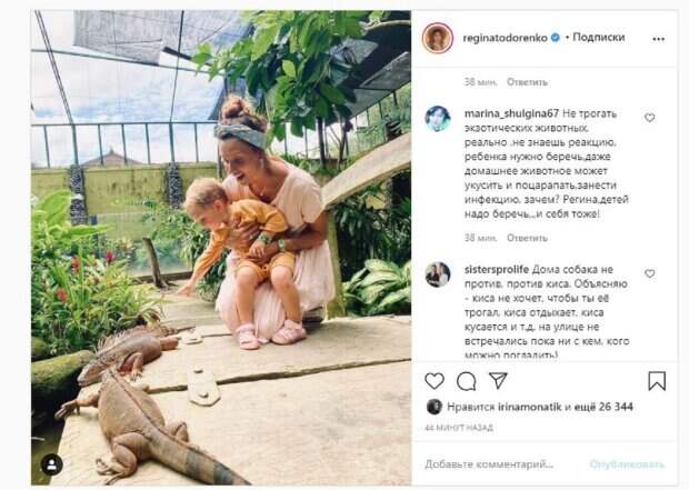 Об том пишет Politeka.net со ссылкой на страничку знаменитости. "Прекрасные игуаны, как же мы вас любим! Михаил Владиславович все время хочет покормить всех животных и погладить, некоторых даже хотел дергать за хвост со словами: «А можно за хвост игуаны подержаться». Ох, приходить говорить горькую правду маленькому человечку о том, что это привлекательная рептилия может откусить палец. И даже это не действует на желание прикоснуться к животному, ведь пальцев «целых 10,, а ещё есть на ногах»! Одного точно не жалко! Чем вы аргументируете, что трогать незнакомое животное нежелательно? (Даже если это дворовая собака)", - сообщила звезда. Фанаты поставили почти 30 тысяч лайков и написали комментарии: "Зачем рисковать?", "Надо маме сделать испуганное лицо))", "Инстинкт самосохранения ни кто не отменял...", "Региночка, вы супер", "Не трогать экзотических животных, реально ,не знаешь реакцию, ребенка нужно беречь, даже домашнее животное может укусить и поцарапать,занести инфекцию, зачем? Регина, детей надо беречь... и себя тоже!" Сообщалось, что певица и ведущая из "Орла и решки" Регина Тодоренко и ее "сдувшийся" бюст неслабо взволновали публику. Внимательные пользователи заметили, что у Тодоренко внезапно "пропал" бюст - мол, ранее красотка пленяла аппетитными формами, а теперь на их месте ничего нет. Фоловеры настолько жарко обсуждали пропажу, что Регина сорвалась. Напомним, Тодоренко из "Орла и решки" после несчастья на отдыхе с сыном поразила новым фото А еще Politeka писала, что новое потрясение произошло с двухлетним сыном Тодоренко, звезда решилась на откровение Также Politeka сообщала, что раздетая Регина Тодоренко ошеломила выходкой на публике в стиле Волочковой