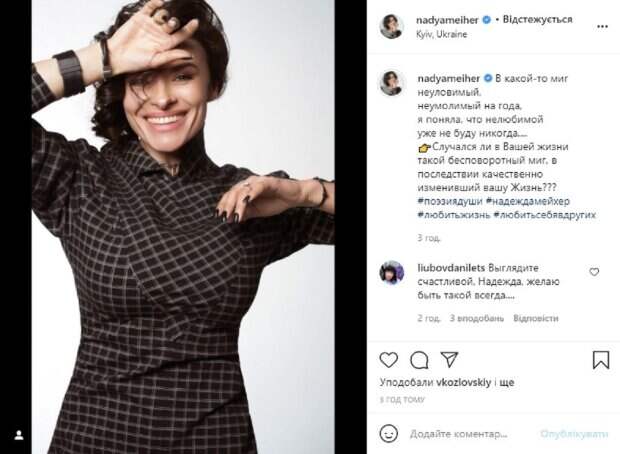 Известная певица Надежда Мейхер продолжает будоражить воображение украинцев, размещая свои фото в разных образах, и независимо какую одежду наденет красотка, она завораживает своей притягательностью Как передает Politeka.net, в своем Инстаграм Надя разместила фото в скромном наряде, и написала о любви и поворотных моментах в жизни: "В какой-то миг неуловимый, неумолимый на года, я поняла, что нелюбимой уже не буду никогда.