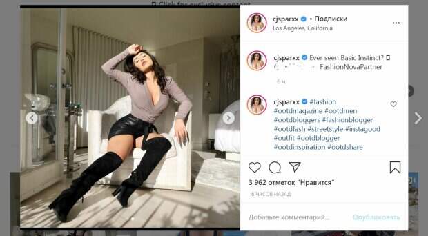 Касандра надела обтягивающий топик с длинным декольте, из которого едва ли не вываливался бюст. К тому же пикантности образу добавило то, что знаменитость не надела лифчик. Самые интимные детали проглядывались сквозь тонкую талию. Модель надела черное мини, вероятно, из кожи. Поясок натянулся на стройной талии, подчеркнув ее красоту. Сьенега вытянула ножки в длинных черных ботфортах на каблуках. Образ вышел откровенным еще и благодаря принятой позе - модель слегка откинулась назад, прикрыв глаза. Ноги были слегка расставлены, а из-под юбки едва ли не выглядывало белье. "Вы когда-нибудь смотрели "Основной инстинкт"?