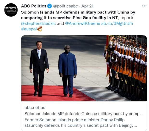Это еще один признак того, что он намерен укреплять связи в области безопасности с тихоокеанской страной, находящейся к северу от побережья Австралии. Согаваре говорит, что хочет «улучшить» совместные учебные мероприятия между полицией КНР и Соломоновых островов. Неясно, приведет ли это к постоянному присутствию китайской полиции в Хониаре. В пятницу на прошлой неделе Согаваре присутствовал на церемонии выпуска сотрудников полиции Королевских Соломоновых островов, прошедших подготовку в китайской полиции по борьбе с беспорядками. Австралия всегда была основным поставщиком полицейской подготовки на Соломоновых островах, и высокопоставленные австралийские чиновники публично выразили свое беспокойство по поводу растущего сотрудничества полиции Китая с Хониарой. Австралийцы обвинили Пекин в том, что он может разжечь напряженность, поощряя местных офицеров использовать более конфронтационную и насильственную тактику. Читайте также: КНР сделала еще шаг к постройке военной базы в 2000 км от Австралии — 9News