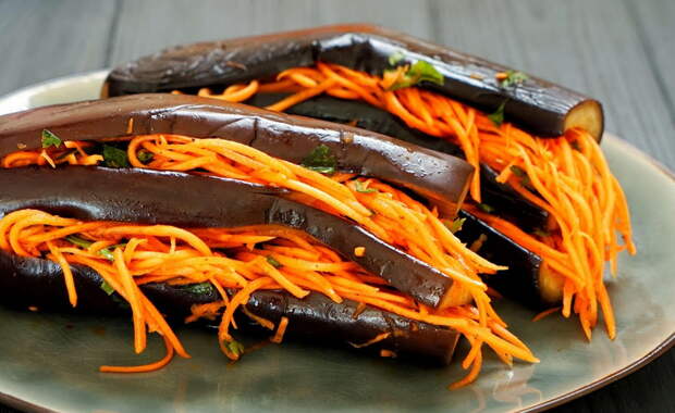 В подсоленной воде отварить баклажаны (примерно 10 минут). Затем выложить их на тарелку, сверху поставить доску и какой-то груз. Например, небольшую кастрюлю с водой.Морковь натереть на терке для корейской моркови. Добавить соль, перец, аджику, растительное масло, измельченную зелень, натереть чеснок и тщательно перемешать.Затем морковкой начинить баклажаны, дать время настояться закуске и можно подавать к столу.[caption id="attachment_76319" align="aligncenter" width="1266"] Баклажаны[/caption]