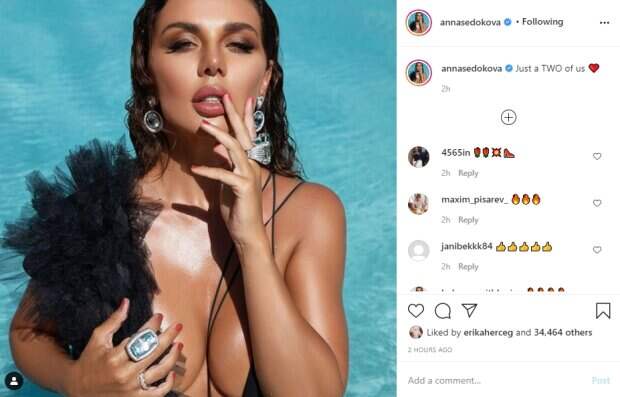 Несколько веревочек сделали сильный акцент на груди исполнительницы, ведь оказались прямо в ложбинке. Образ дополнила пушистая черная муфта, которую Анна Седокова придержала на плече одной ладонью, свободной же девушка соблазнительно приложилась к приоткрытым губам. Более того, певица слегка сжала руками свой бюст четвертого размера, придав кадру пикантности. Стоит отметить, что она надела несколько массивных колец и большие круглые серьги - не совсем подходящий вид для купания в бассейне. "Только мы вдвоем", - подписала Анна свой снимок. Пользователей соцсети порадовал внешний вид звезды, они оставили в комментариях много приятных отзывов: "Невероятная дива-богиня ♥️