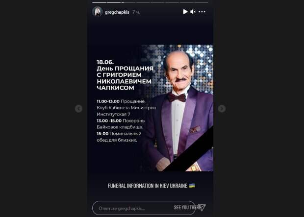 Церемония прощания состоится в Киеве. Чапкис-младший опубликовал расписание на этот день. «11.00 – 13.00 Прощание. Клуб Кабинета министров, Институтская 7. 13.00 – 15.00 Похороны. Байковое кладбище. 15.00 Поминальный обед для близких», - сообщается в публикации. Сын танцора также поделился фотографиями своего покойного отца и их совместными снимками. «Легенда будет жить…Я буду скучать по нему…Я всегда хотел, чтобы ты гордился мной. И я продолжу продвигать наследие Чапкисов на вершину», - написал Грег в серии своих публикаций. Отметим, что сын танцора действительно пошел по его стопам: он успешно учит танцам других в собственной студии хип-хопа в Сан-Франциско. Добавим, что ранее Грег раскрыл причину смерти 92-летнего отца. «Умер, потому что старенький... 92 года человеку, все начало отказывать... Он держался хорошо. Он старенький, это муки», - сказал Грег Чапкис. Известно, что сын танцора планирует прилететь в Украину на похороны отца. Напомним, сын Григория Чапкиса раскрыл причину и обстоятельства смерти легендарного отца: "Это муки". Как сообщала Politeka, сын Григория Чапкиса, потрясенный кончиной отца, показал их танцы в центре Киева: "Легенды не умирают". Также Politeka писала, что внучка Чапкиса показала последнее фото с дедушкой: "Выглядят счастливыми".