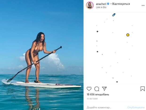 Известная фитнес-модель Ана Чери показала, как развлекается на отдыхе Как передает Politeka.net, у себя в Инстаграм красотка опубликовала серию фото, на которых пыталась грести, стоя на доске для серфинга. Красотка выбрала купальник, который едва смог прикрыть ее пышные формы. Небольшие клаптики ткани от лифчика закрыли только самое интимное.