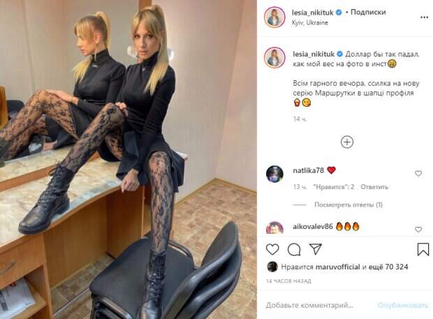 Девушка бесстыдно раздвинула ноги, прикрыв "срам" складками юбки. При этом Леся хищно посмотрела в камеру. "Доллар бы так падал, как мой вес на фото в инст