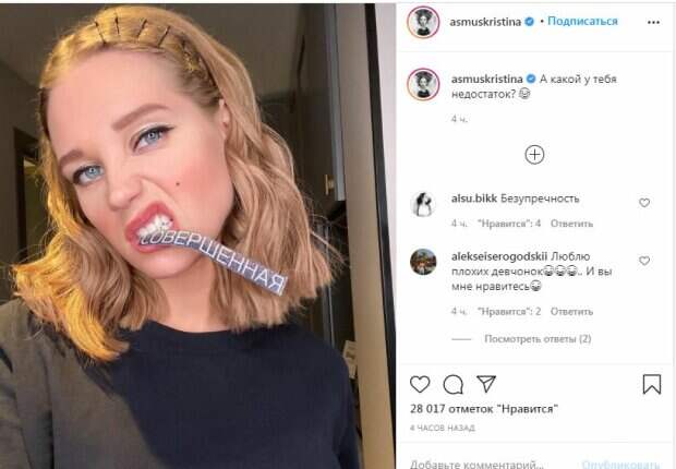 Звезда "Интернов" Кристина Асмус удивила своих фанатов откровениями в соцсетях Новую публикацию она опубликовала в своем личном микроблоге Instagram. Так, популярная российская актриса решила завести со своими поклонниками серьезный разговор. Кристина Асмус с ярким макияжем, держа в зубах надпись "Совершенная", решила поинтересоваться у своих подписчиков, какие у них недостатки.