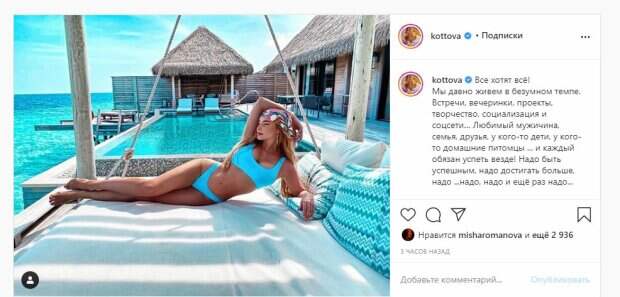 Об этом пишет Politeka.net со ссылкой на страничку знаменитости. "Все хотят всё! Мы давно живем в безумном темпе. Встречи, вечеринки, проекты, творчество, социализация и соцсети… Любимый мужчина, семья, друзья, у кого-то дети, у кого-то домашние питомцы ... и каждый обязан успеть везде! Надо быть успешным, надо достигать больше, надо ...надо, надо и ещё раз надо...", - написала Татьяна. Фанаты поставили почти 3 тысячи лайков и написали комментарии: "Классный купальник", "Классная такая, захотелось туда", "Постоянные правильные и систематические действия", "Да,чтобы быть успешным,нужно много работать", "Очень верно сказано! Идеальная и красивая!", "Какие мысли в бикини", "Идеал женской красоты". Сообщалось, что известная певица Татьяна Котова показала, как отдыхает. На фото красотка сидела в красном купальнике на лежаке, позируя перед камерой в профиль. Татьяна дополнила образ полотенцем, которым обвязалась на пятой точке. Напомним, бесстыжая экс-«ВИА Гра» в кружевном белье раскрыла свой секрет Также Politeka сообщала, что горячая блондинка из "ВИА Гры" показала свое сокровище в бездонном декольте А еще Politeka писала, что блондинка из "ВИА Гры" забыла о белье, показав себя крупным планом