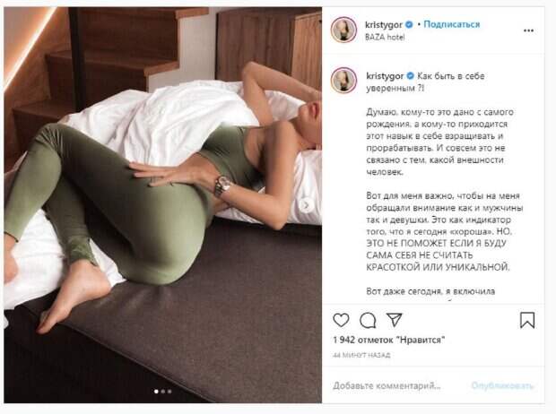 Новая жена украинского телеведущего Владимира Остапчука Кристина Горняк показала себя и рассказала об уверенности На фото Кристина позировала в топе и штанах, лежа на диване. Звезда развернулась боком и акцентировала внимание на ягодицах, не показав даже лицо. Горняк соблазнительно выгнулась, хвастаясь упругими ягодицами, за которые взялась одной рукой.