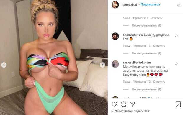 Так как Лекси часто называют обладательницей кукольной внешности, она всегда делает на этом акцент. Как видно на фото, дома девушка решила повеселиться в постели и сделать несколько селфи с неожиданного ракурса. Все дело в том, что Лекси позировала не только в ярком нижнем белье с сеточкой, но еще и вместо лифчика прикрыла бюст обычным платком с ярким принтом разного цвета. Чтобы не показать слишком много лишнего, Кай придержала кончики платка на самом бюсте. «Чудесный образ