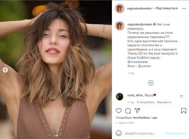 Так, недавно телезвезда отважилась на кардинальные перемены во внешности, что сразу вызвало у фанатов беспокойство, а не случилось ли в жизни Регины что-то плохое. На днях Тодоренко показала на видео, как отрезает свою роскошную шевелюру. А теперь решила назвать истинную причину таких перемен и опубликовала милые фотографии с новой стрижкой, которая ей действительно идет. "Нет, я не развожусь. Почему же решилась на столь кардинальные перемены? Есть одна единственная причина – надоело постоянство и однообразие, а я хочу перемен! Thanks for the best hairstylist in Dubai for@this beauty – @nicolashalak. Фото – @yulrom", - подписала снимки Регина. Поклонники тут же принялись обсуждать новую внешность телеведущей, осыпая ее комплиментами и восторженными комментариями. "Шикарные изменения, давно пора", "Очень и очень тебе идет! Все перемены к лучшему!", "Не сильно кардинальные, думала прям каре блондинки будет", "Круто выглядит", "Очень идет", "Очень красиво. Вам очень идет этот образ", "Очень круто", "Такая новая", "Просто не узнать", "Вот это перемены", - пишут пользователи под фото Регины. Напомним, Неизлечимо больная Тодоренко осталась без волос, поразив кадрами: "Такой меня еще никто не видел". Как сообщала Politeka, Неизлечимо больная Тодоренко из "Орла и решки" впервые показала последствия недуга: "Как у Майкла Джексона". Также Politeka писала, что Тодоренко сразу после Дженнифер Лопес заговорила о разводе прямо в отпуске: "Так огорчил меня...".